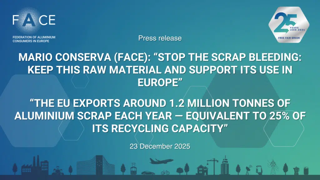 “The European Union is structurally deficient in primary aluminium and cannot afford to lose, through scrap exports, a strategic resource for the competitiveness of its industry.” This is the message from Mario Conserva, Secretary General of FACE – Federation of Aluminium Consumers in Europe, who stresses the urgency of a coordinated political and industrial response.