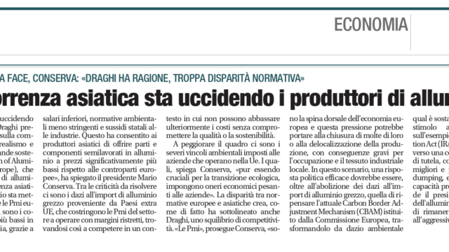 La concorrenza asiatica sta uccidendo i produttori di alluminio UE Il Presidente FACE Conserva: “Draghi ha ragione, troppa disparità normativa” &...