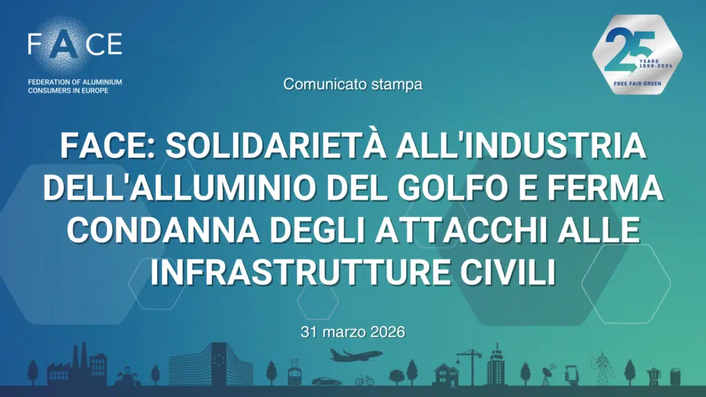 In un momento di profonda incertezza e crescente tensione regionale, FACE (Federation of Aluminium Consumers in Europe) desidera riaffermare con forza il proprio legame di profonda amicizia e cooperazione con i partner del Golfo, esprimendo la più sincera solidarietà a EGA (Emirates Global Aluminium), ad Alba (Aluminium Bahrain) e a tutti gli attori dell’industria dell’alluminio della regione, che rappresentano un pilastro fondamentale per il mercato globale e per la nostra Federazione.