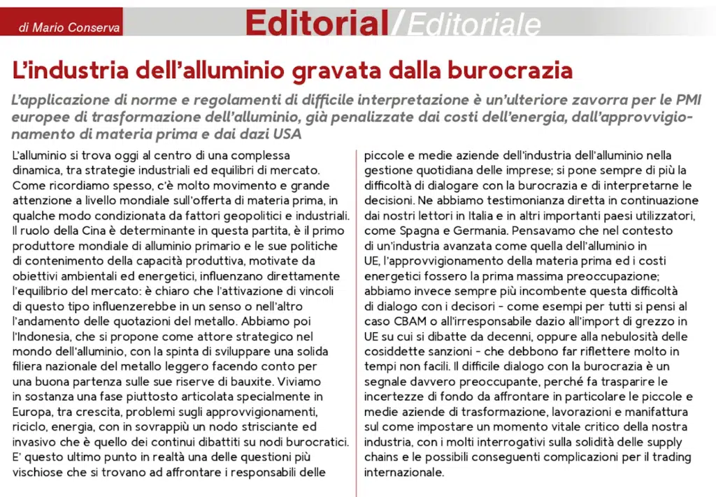 L’industria europea dell’alluminio sta attraversando una fase di forte complessità, in cui alle sfide globali legate a energia, approvvigionamenti e geopolitica si aggiunge un fattore sempre più critico: l’aumento della pressione normativa e burocratica.