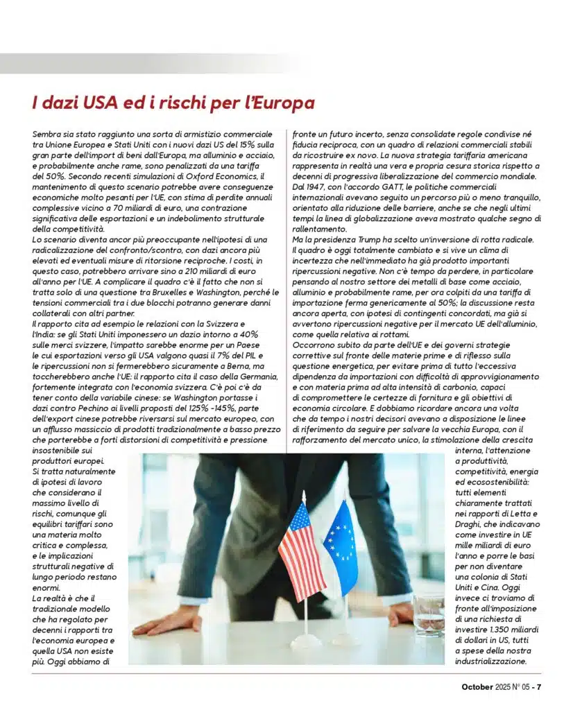 Il recente scenario commerciale tra Stati Uniti e Unione Europea segna una svolta storica. Le nuove tariffe americane – fino al 50% su acciaio, alluminio e rame – rischiano di compromettere la competitività europea, con perdite stimate fino a 70 miliardi di euro l’anno.