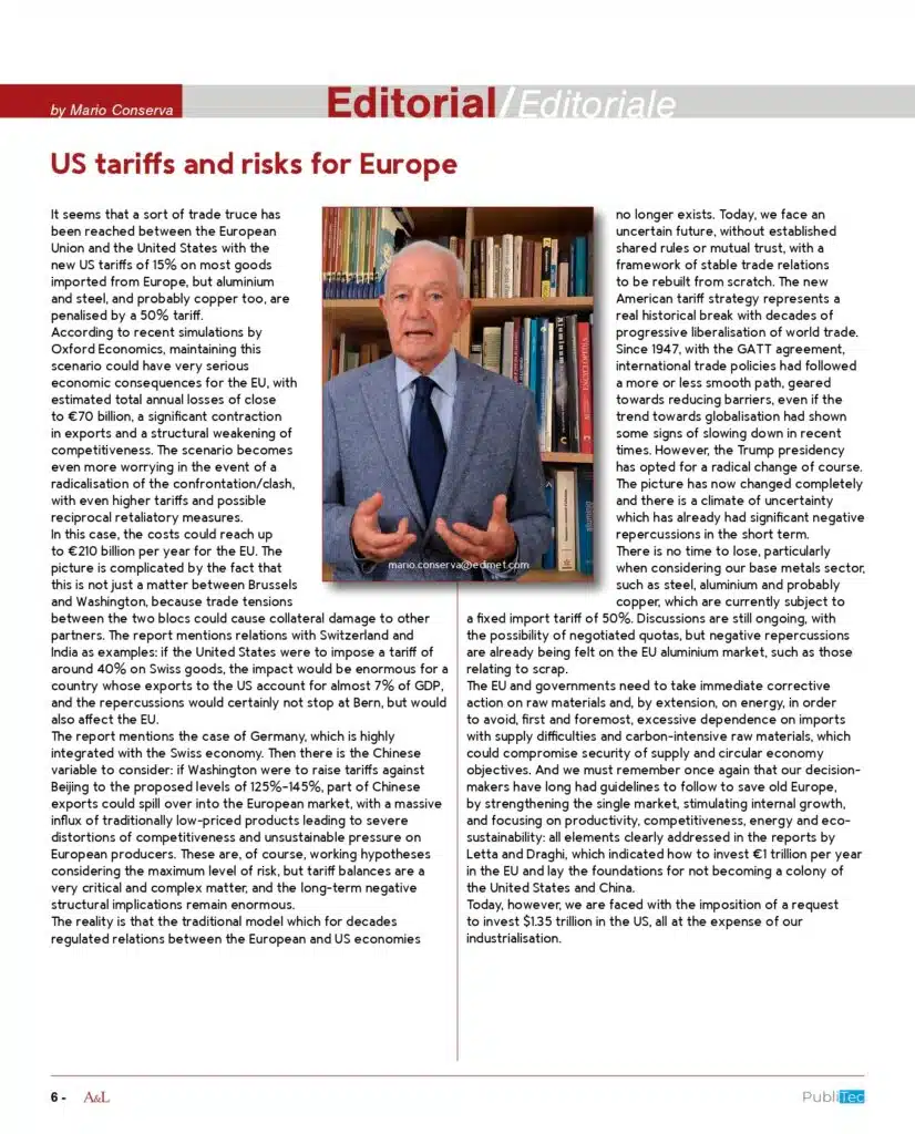 The recent trade developments between the United States and the European Union mark a critical turning point for Europe’s industrial future. The new US tariffs – reaching up to 50% on aluminium, steel and copper – could severely impact Europe’s competitiveness, with estimated annual losses of around €70 billion.