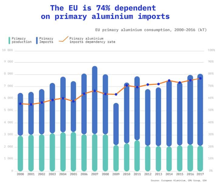 The structural decline of primary aluminium smelters has a negative effect on supply chains in the EU, leaving the downstream sector increasingly dependent on imports that are subject to EU import tariffs. The 2019 LUISS study underlined that EU raw aluminium import tariffs had resulted in an extra cost of up to €18 billion to the continent’s downstream aluminium SMEs between 2000 and 2017. In June, FACE restarted its campaign calling on European institutions to zero import tariffs on raw aluminium.